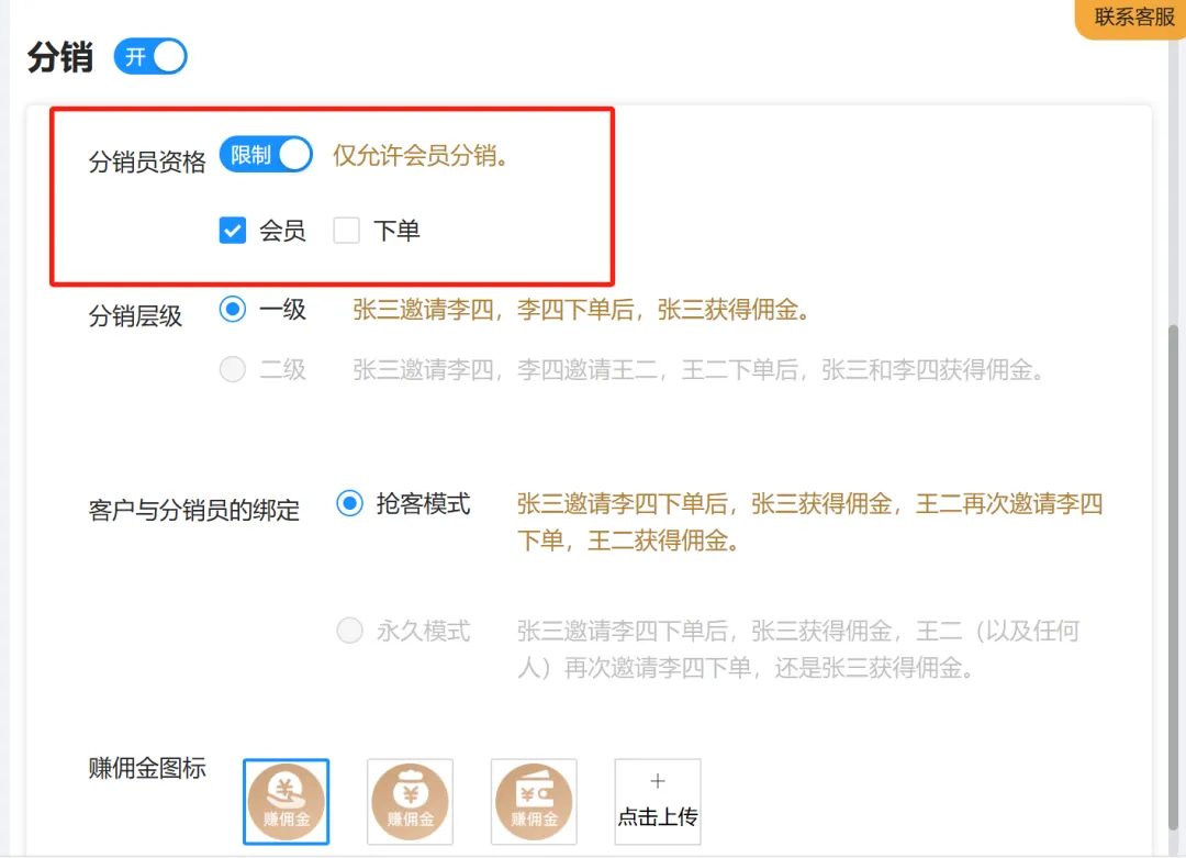 根据实际需求,可以灵活设置。希望更多人参与分销、扩大传播,可选择【无限制】分销,任何人都可以成为分销员;想要设立门槛更精准去获客,可以选择【限制】分销:会员或者是已经下单的顾客作为分销员。